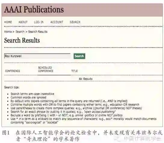 在库兹韦尔的主页上[4],他和比尔·盖茨的合影映入眼帘,他把自己描绘成一个“不知疲倦的天才”和一个“终极思考机器”,并称自己是语音合成等多项重大技术的发明人。事实是否如此呢?笔者检索了国际权威的人工智能组织——国际人工智能学会(AAAI)论文库,并未发现库兹韦尔或者其“奇点理论”的任何论文(如图1所示)。在德国DBLP论文库检索中,笔者发现库兹韦尔最近20年仅有的几篇文章要么是没有具体技术内容的摘要,要么是没有任何基于数据和科学实验的口水文章。也许有人会说,库兹韦尔不写科学论文,是个实践性发明人才。事实是否如此呢?库兹韦尔说他发明语音合成和语音识别这两点成立吗?