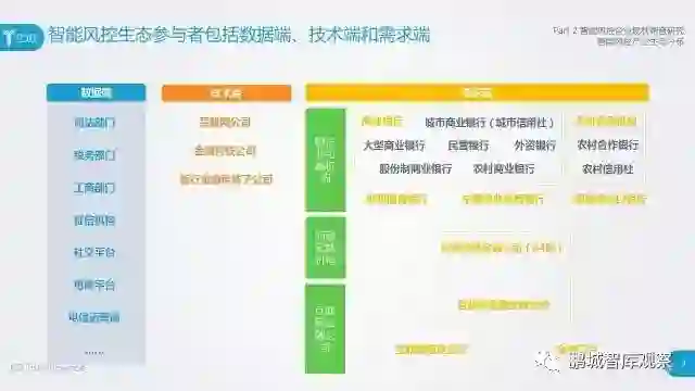 金融机构智能风控的技术服务,可以将其分为三类:互联网公司、银行金融科技子公司和金融科技公司。其中互联网公司是从数据端切入信贷风控业务,而创新型公司大多从技术端切入。征信企业作为中小微企业信贷授信过程中的衍生机构,随着大数据采集技术的成熟和数据量的积累,也在积极利用大数据、人工智能等技术推进智能化征信体系建设。