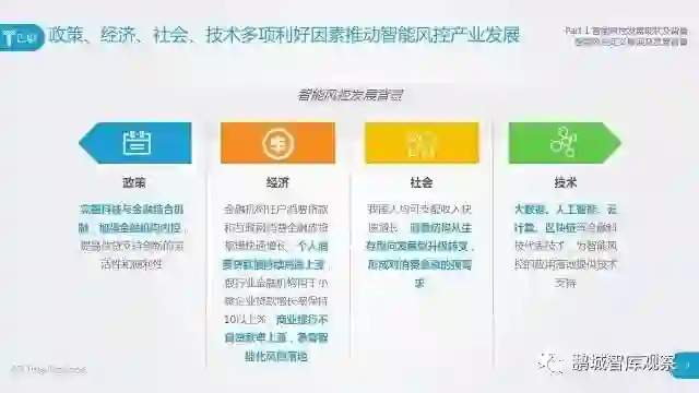 市场上对于智能风控的定义还受限于大数据风控,定义片面甚至混乱。随着人工智能发展进入落地阶段,对于“智能”的定义已不局限于大数据或者人工智能等技术的应用。亿欧智库通过企业拜访和专家调研,智能风控与传统风控的互补和革新主要体现在两个方面——技术和应用,而政策、经济、社会、技术多项利好因素推动智能风控产业发展。