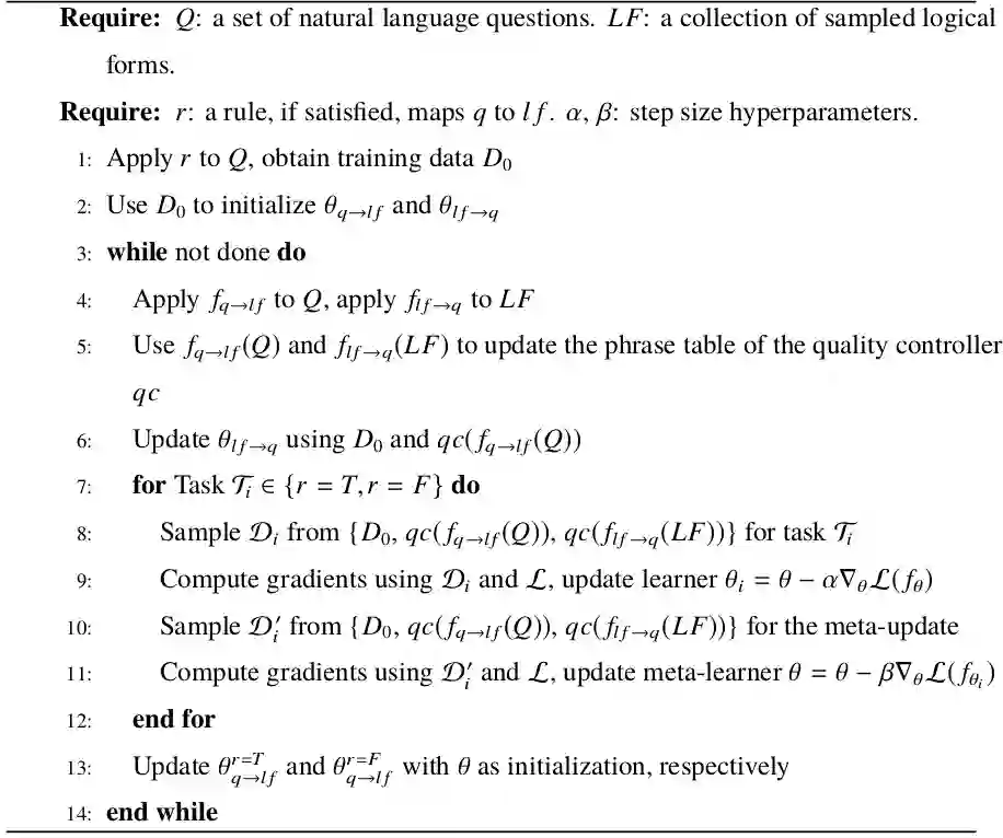 本文提出利用反向翻译和元学习来训练神经语义解析器。学习过程的具体算法在算法上图中展现。
