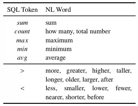 本文首先检测WHERE表达式中的属性值,在WikiSQL数据集中,这些出现在表格单元格中的属性值一般与自然语言查询中的描述一致,可以较为容易的被匹配得到。得到WHERE表达式中的属性值后,即可选择该属性值所在的一列的列标题作为WHERE表达式中该条件的列标题。如果一个单元格出现在多个列中,本文选择与自然语言查询重叠的单词较多的列标题,并限制共出现的单词数大于1。随后本文只需确定WHERE表达式中这个条件的运算符。在默认情况下,这个运算符为=。但在值的周围单词包含表中列出的>和<等关键字的情况下,则将其设置为对应的运算符,例如自然语言查询中若出现了单词"more"和"greater",则倾向于映射到WHERE运算符">"。WHERE表达式生成完毕后,本文开始生成SELECT表达式。本文设定SELECT表达式中的列标题必须是与自然语言查询具有最多的共现单词的列标题,且该列标题不能与任何出现在WHERE表达式中的列标题相同。如果有多个候选列标题符合上述为SELECT表达式制定的规则,则丢弃此条数据。最后本文确定SELECT表达式中的聚合器。默认情况下,聚合器为NONE。若自然语言查询中的单词匹配上了表中的任何关键字,本文将聚合器设置为对应的符号。例如,自然语言查询中若出现了单词"average",则倾向于映射到聚合器"avg"。本文的规则在WikiSQL数据集的训练集上的覆盖率为78.4%,其执行准确率为77.9%。