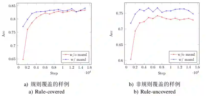 如果只有规则所涵盖的样例,例如在初始化阶段使用的样例,元学习将学习一个良好的初始参数,该参数通过对来自同一分布的样例的有用性进行评估。在训练阶段,本文的语义解析器可以生成两个任务的所需的训练数据,元学习模型学习到如何学习一个初始化参数的能力,该参数可以快速有效地适应两个任务中样例的需求。在测试阶段,可以使用规则来检测输入样例是否被其覆盖,以决定输入样例所属于哪个任务,并使用相应的针对于特定任务的模型来对输入样例进行预测。在处理规则覆盖的示例时,可以直接使用规则进行预测,也可以使用通过元学习训练得到的模型,这取决于所学习的模型对开发集规则覆盖的样例的准确性。