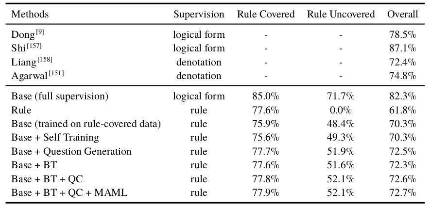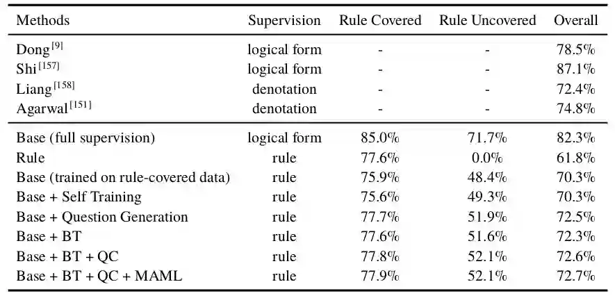 本文提出了一种在没有标注好的自然语言查询对应的逻辑表达式或其执行答案的条件下,只从简单的与领域无关的规则中学习神经语义解析器的方法。本文提出的方法从规则所涵盖的示例开始,规则用于在反向翻译范式中初始化语义解析器和问题生成器。本文在统计分析的基础上对生成的样例进行测量和过滤,并使用了模型不可知元学习,这保证了模型在对规则覆盖的样例确保准确性和稳定性的同时也获得了很好的对非规则覆盖实例的泛化性和通用性。本文对三个数据集进行了面向表格和面向知识库的自动问答任务的实验。结果表明,采用不同的策略可以逐步提高系统的性能。本文在WikiSQL数据集上的最佳模型达到了当前最佳的从答案中学习的系统的精度。在未来,本文计划关注更复杂的逻辑形式。