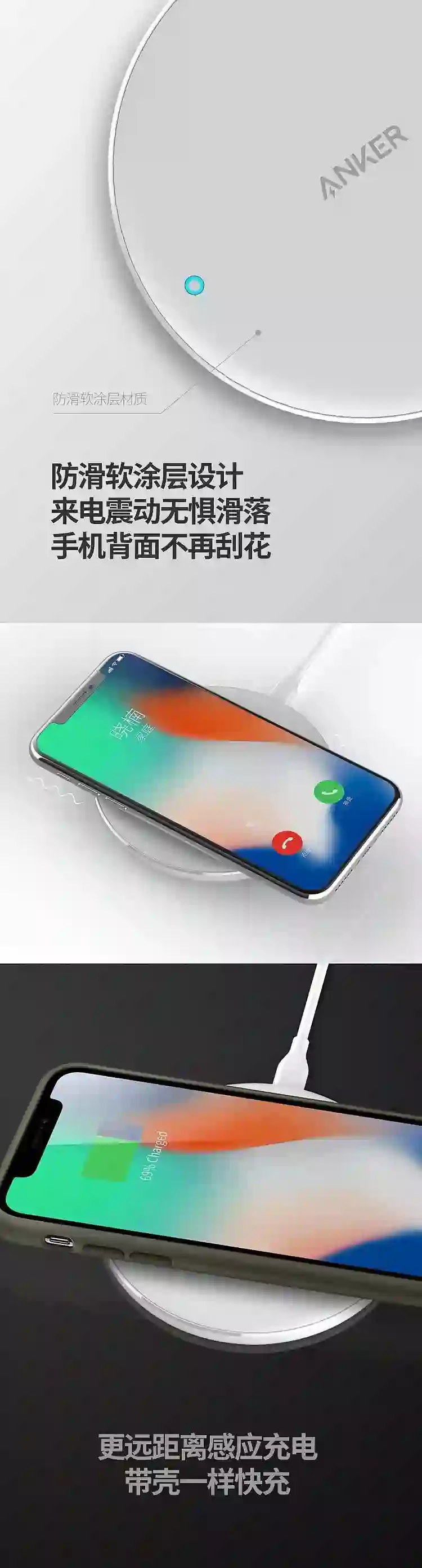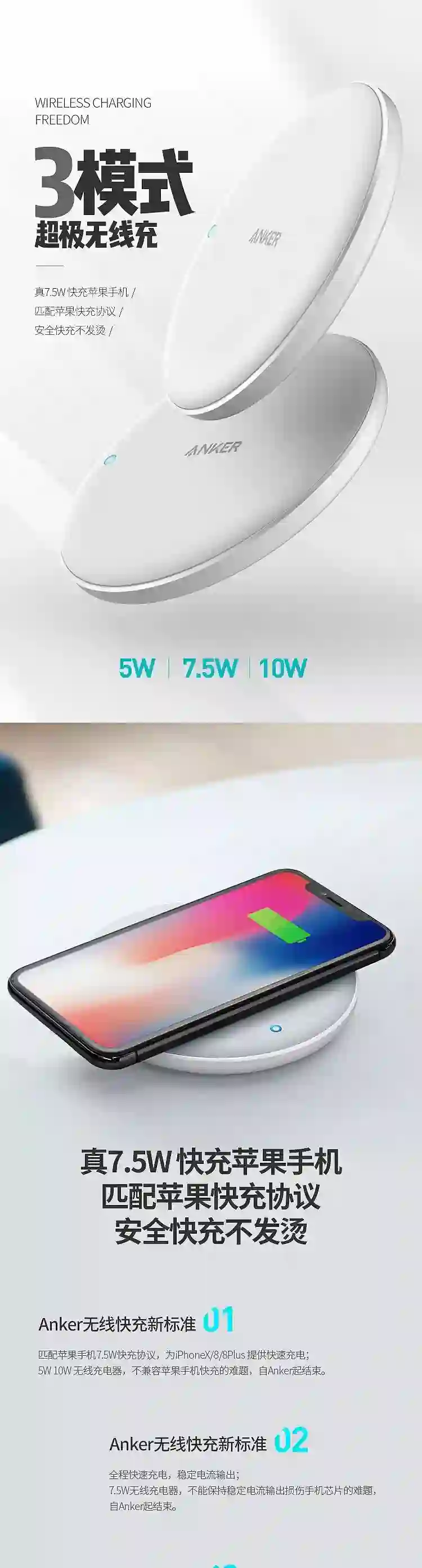 2. 高效率充电:效率是无线充电的关键参数,效率越高意味着同样时间,冲进手机的电量越多,即使提高1个百分点也会很显著。我们这款产品使用高效率元器件,相比通常7.5W产品60~65%的效率,Anker这款产品达到了73%。