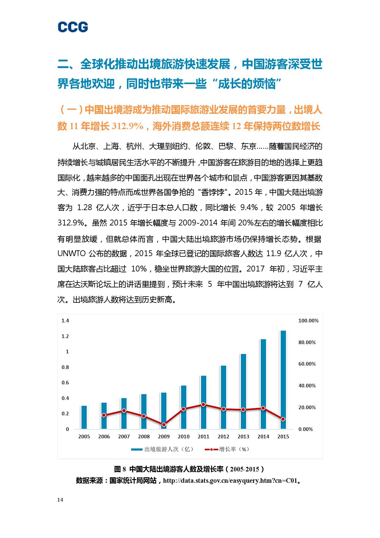 全球化智库(CCG)与携程旅行网(Ctrip)联合发布的《从出入境旅游看中国全球化发展》系列报告一分析指出,中国游客出境旅游的需求在多种因素下被释放和点燃,但是出境旅游的矛盾也日益彰显。从需求侧来看,出境游本身具有国际化属性。随着人们出境游经验的不断积累和在旅途见识的不断增长,中国游客对于出境游的需求和要求也越来越细化和专业、越来越与国际接轨。然而,从供给侧来看,虽然产生的行为是赴境外出游,但很多旅游产品都是通过国内渠道进行宣传和销售,且当前我国国内旅游产业发展中仍存在一些不正规的、采用不正当竞争的、甚至非法的旅游服务供应商,严重影响了游客的出行体验,甚至侵害了游客的合法权益。此外,部分中国出境游客“不文明”的旅游行为也屡受曝光,给旅游目的地居民和同游的游客留下不好的印象。