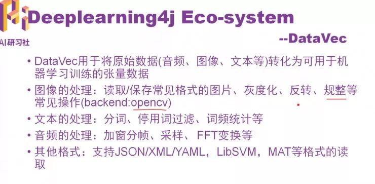 数据 ETL 库,称之为 DataVec, 它的主要功能就是把语音信号,图片文件,文本文档转化为张量形式,做数据 ETL.