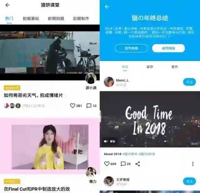 以猫饼app为例,产品主打的“猫饼课堂”栏目涵盖了拍摄基础、前期拍摄、后期制作等,能够以简明的方式帮助普通人完成入门和进阶。