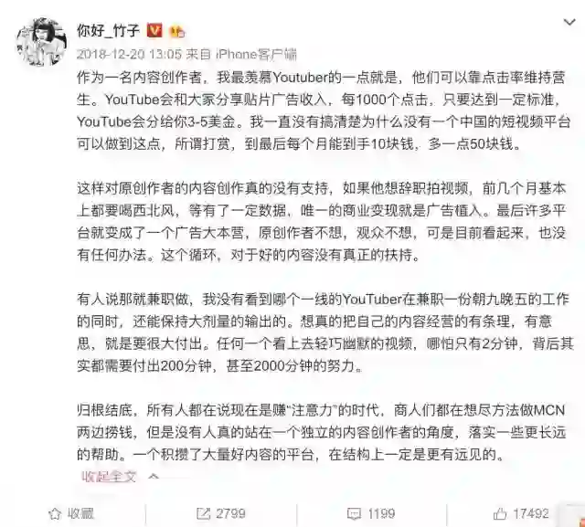 在微博拥有220万粉丝的vlogger竹子,曾在近期发此感慨:“作为一名内容创作者,我最羡慕YouTuber的一点是,他们可以靠点击率维持营生。”