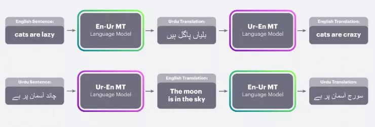 一旦系统经过训练,我们就可以用它将英语中的许多句子翻译成乌尔都语,形成另一种类型的数据集(原始句子为英语,翻译成乌尔都语),有利于改进以前的乌尔都语到英语的 MT 系统。随着一个系统得到改进,我们可以使用它以迭代方式在相反方向上为系统生成训练数据,并根据需要进行多次迭代。