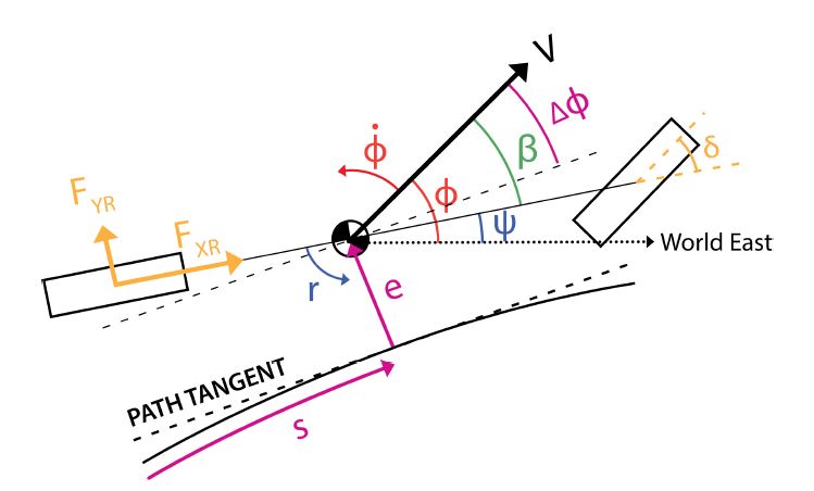 利用曲线坐标系使车辆跟踪参考轨迹,侧向位移误差 e 是车辆质心到参考轨迹的最近点的距离,s 是沿路径到这个点的距离。参考航向角 是 s 处路径相对于惯性坐标系的正切角,航向角误差