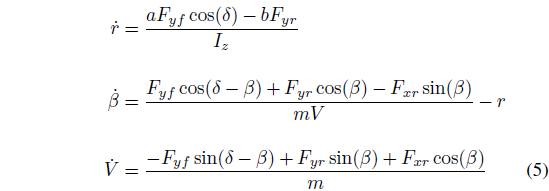 值得注意的是在完全饱和状态下,这个关系同刷子轮胎模型 [7] 和简化魔术公式轮胎模型 [1] 表达是一致的。系统的控制输入,在车轮动力学 ω 中表达为: