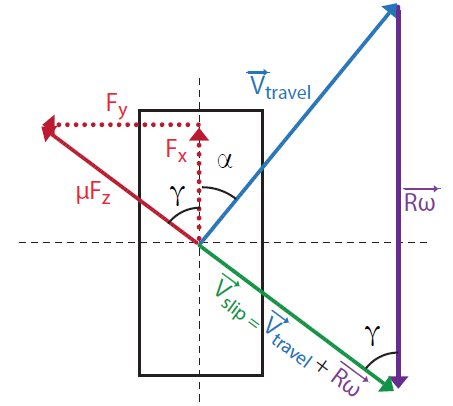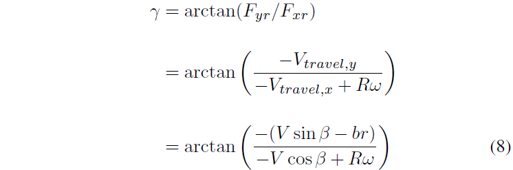 该方法忽略了车轮动力学,但当考虑更复杂轨迹工况时车轮动力学是相当重要的;Fxr 不是真正的输入,而是轮胎与路面滑移的结果。对于完全饱和的轮胎,力和滑移的关系可以以一种既简单又有物理意义的方法进行建模:力大小为 μFz,其方向与滑移速度矢量 Vslip 方向相反。定义这个方向为推力角 γ,如图 3 所示,改变 Rω 矢量的长度可以直接改变 γ。几何关系为:
