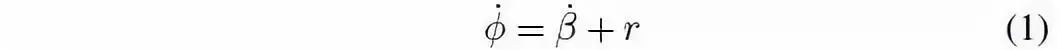 车辆模型如图 2 所示,有三个状态变量:横摆角速度 r、速度 V 和质心侧偏角 β。考虑路径跟踪后,引入了其他几个状态变量。车辆航向角是车辆速度矢量在给定的惯性坐标系的方向,φ 的动力学方程:
