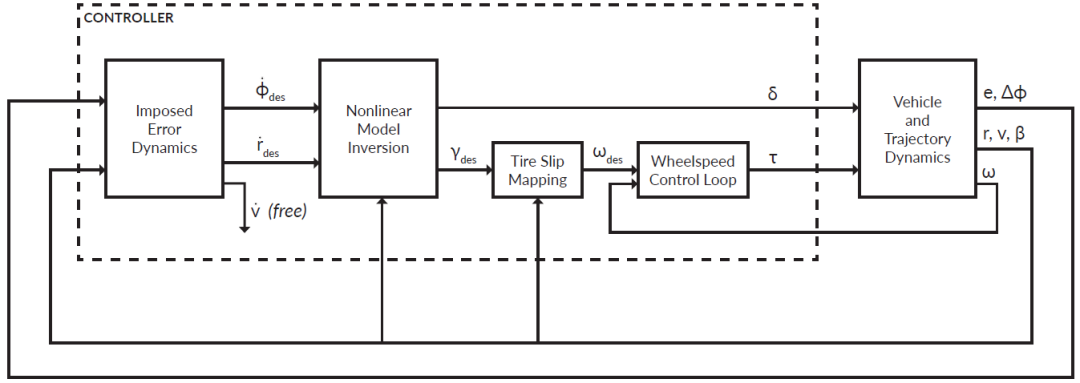 传统车辆控制架构中通常采用独立的侧向/纵向控制,并且假定车辆处于侧滑动力学稳定范围内。然而,超出车辆的操控极限时会产生强输入耦合和横摆/侧滑不稳定性,导致这种简化方法失效。尽管是完全在车辆稳定性极限范围外操纵的,专业驾驶员在漂移中可以同时实现对车辆侧滑和行驶路径两者的精确控制。自动驾驶漂移控制算法可以将车辆可用状态空间扩展到极限范围外,从而确保自动驾驶车辆最广泛的机动范围。