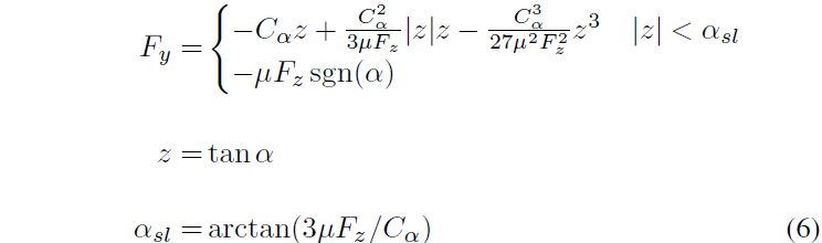 前轴侧向力 Fyf 采用 Fiala 刷子轮胎模型 [2] 表示,文献 [3] [4] 中的漂移控制器中也采用了该模型。