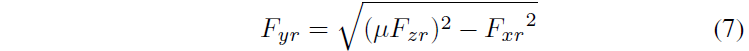 漂移时,整个后轮轮胎接地面处于完全滑动的状态。假设各向同性摩擦系数,侧向力和纵向力受摩擦圆关系约束: