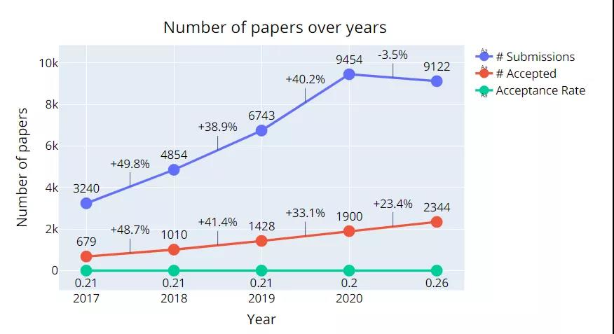 据大会官方统计,今年 NeurIPS 共有 9122 篇有效论文投稿,共接收 2344 篇,总接收率 26%,有 3% 被接收为 Spotlight 论文。相比去年,论文接收率稍高了一些,达到了 2013 年以来的最高水平。