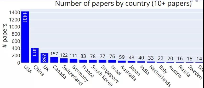 从国家 / 地区的角度看,中稿量排名前三的分别是:美国(1431 篇)、中国(411 篇)、英国(268 篇)。