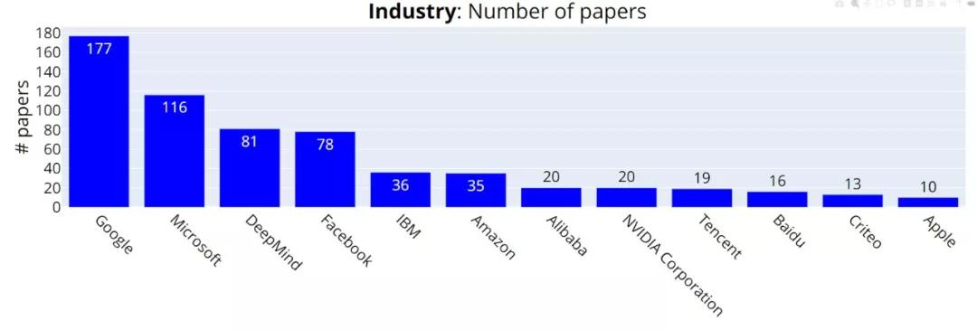 在投稿机构方面,NeurIPS 2021 中稿量(Accepted)排名前三的公司分别是谷歌(177 篇)、微软(116 篇)和 DeepMind (81 篇)。