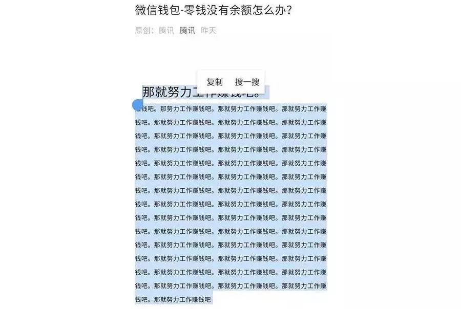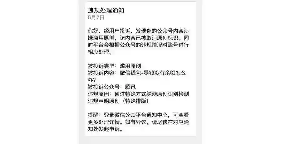 新榜讯 今天中午,「腾讯」官方发布原创文章《微信钱包-零钱没有余额怎么办?》,文章显示只有“那就努力工作赚钱吧”9个字(为了凑够300字文章用了重复的排版和隐藏了文字),结果最终被微信以“滥用原创”为由取消原创。