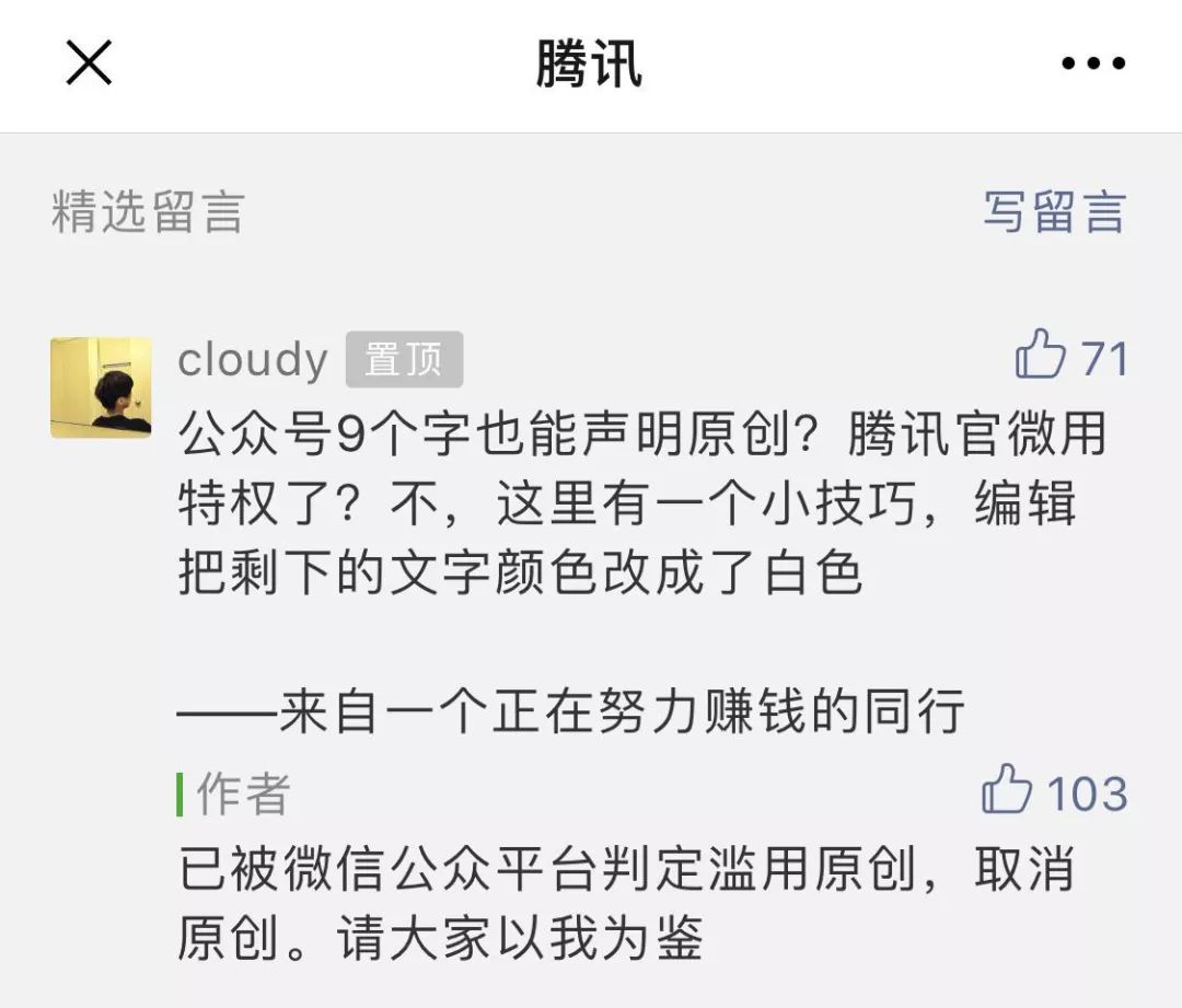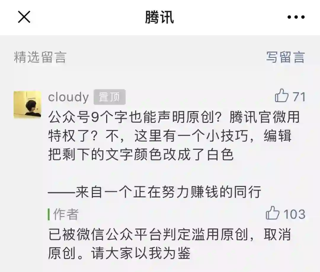 评论中有网友质疑,腾讯官微是否有特权,9个字也能声明原创。对此「腾讯」回复:“已被微信公众平台判定滥用原创,取消原创。请大家以我为鉴。”