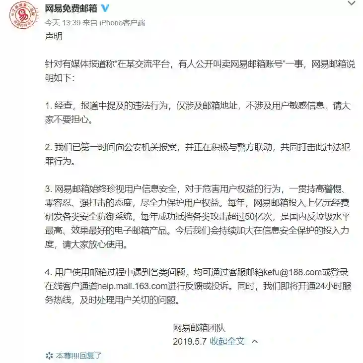 针对“网易邮箱账号遭公开叫卖”事件,@网易免费邮箱 发表声明称,报道中提及的违法行为,仅涉及邮箱地址,不涉及用户敏感信息,并已第一时间向公安机关报案。