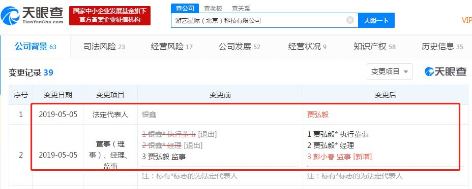 新榜讯 天眼查数据显示,5月5日,快手旗下子公司游艺星际(北京)科技有限公司法定代表人和高管人员均发生变更,快手联合创始人银鑫卸任法定代表人以及执行董事、经理职务,均由贾弘毅接任。