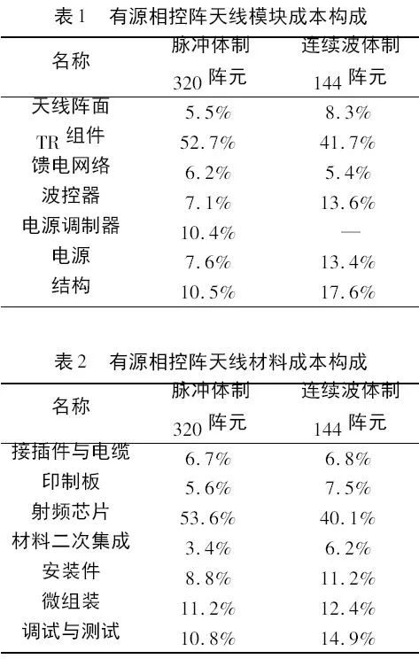 天线阵面主要包括辐射单元、金属基板、射频接插件等。TR 组件包括TR 腔体、PCB 板或LTCC 板、软基片、功率放大器、低噪声放大器、移相器、串并转换、滤波器,温度补偿、射频接插件、以及低频接插件等,对有源相控阵天线来说,TR 组件占成本的主要部分。馈电网络包括收发共用馈线、发射功率分配网络,以及接收信号合成网络; 通常情况下,为了确保接收支路的增益和使发射支路的末级放大器推饱和,需要在接收支路中增加驱动级低噪声放大器和在发射支路中增加驱动级功率放大器,对于有单脉冲测角要求的,馈电网络还需设计成和波束、方位差和俯仰差波束接收通道,这些都会导致有源相控阵天线成本增加。波控器核心器件是FPGA,其主要功能是将终端控制命令计算成控制TR 组件内移相器的TTL /LVTTL 电平,并生成移相码,从而改变天线阵面信号相位因子,完成有源相控阵天线的波束快速扫描,此外波控器还可以具有电源分发的功能,从而实现给TR 组件内的芯片供电,并具备校准测试的配合执行功能( 适应TR 组件自动测试和天线内/外校准功能) 。电源主要实现的功能是将直流电压转换成各个器件需要的电源值,即DC /DC 转换,对于脉冲工作体制的天线,电源还需包含信号调制器,从而实现连续波信号转换成脉冲信号。