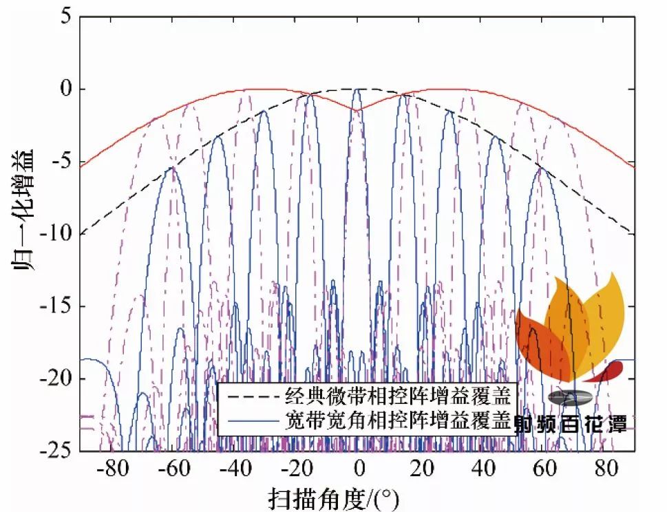 瓦式架构、多功能芯片集成以及数字阵列技术均是从减少元器件数量和工艺互连的角度进行的低成本设计思路。从技术上分析,降低有源相控阵天线成本的思路还可以在保证阵列增益不降( 或提高) 的前提下,进一步减小阵列规模/数量( 射频通道数) 。一种有效的技术途径就是采用宽带宽角扫描技术来实现。这种方法避免了采用稀疏阵在降低相控阵天线成本的同时阵列增益也下降的缺陷。此外,在有源相控阵天线工作体制能够兼容的情况下,还可以将多副窄带相控阵天线用一副宽带相控阵天线来实现[18],通过采用数字多波束形成技术,以实现多个目标、多个任务的兼容,最终实现相控阵天线成本的最优化。