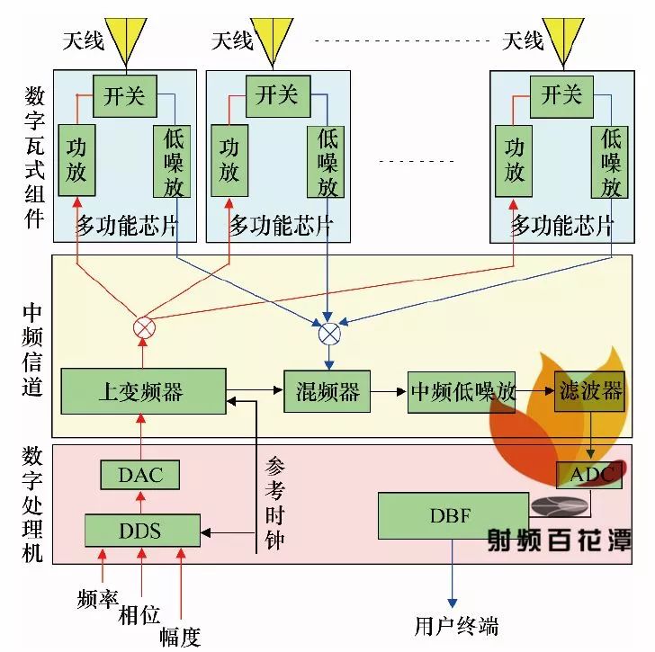 针对上述总体设计思路,图2 给出了典型的数字阵列相控阵天线的设计框图,它由阵列天线、数字TR 组件( 多功能芯片组件) 、中频信道、数字处理机组成。直接数字综合器( DDS) 输入信号主要包括频率、相位、幅度3 个二进制形式的控制信号,以及一个时钟信号( 参考频率) 。发射时,由DDS 产生的基带信号经数模转换器( DAC) 变成模拟信号,经上变频器后产生相控阵天线的发射激励信号,再经数字TR 组件的功率放大器传送到天线单元,最后由各天线单元的辐射信号在空间合成所需的发射方向图。接收时,DDS 产生本振基带信号,经DAC 和上变频器后变为接收本振信号,与数字TR 组件的低噪声放大器接收下来的天线单元的射频信号进行混频,获得中频信号,再经中频放大器、滤波器、模数转换器( ADC) 变换,获得二进制形式的数字信号,最后通过DBF 实现自适应波束形成和软件化信号处理,传到用户终端。