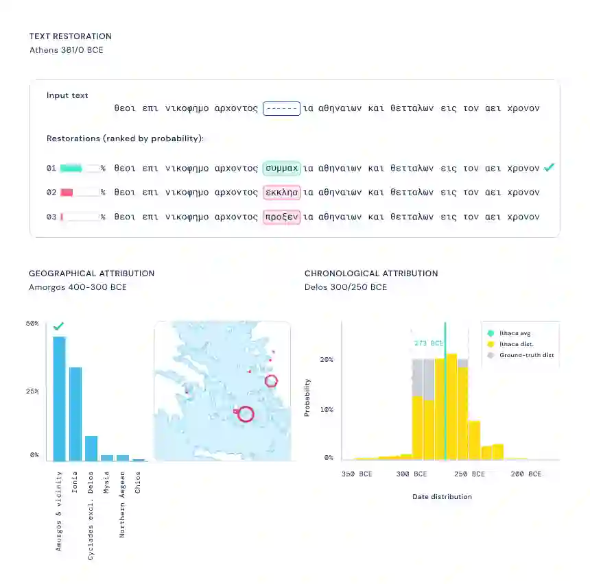 为了最大限度地发挥 Ithaca 作为研究工具的价值,该研究还创建了许多视觉辅助工具,以确保 Ithaca 的研究结果易于被历史学家解读: