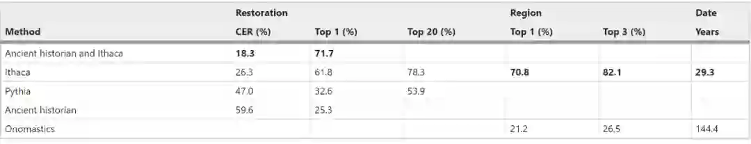 如下表 所示,对于恢复任务,Ithaca 始终优于竞争方法,获得 26.3% 的 CER 和 61.8% 的 top 1 准确率。具体来说,与人类专家相比,Ithaca 实现了 2.2 倍(即更好)的 CER,而与 Pythia 相比,Ithaca 的 top 20 预测实现了 1.5 倍的性能提升,准确率为 78.3%。