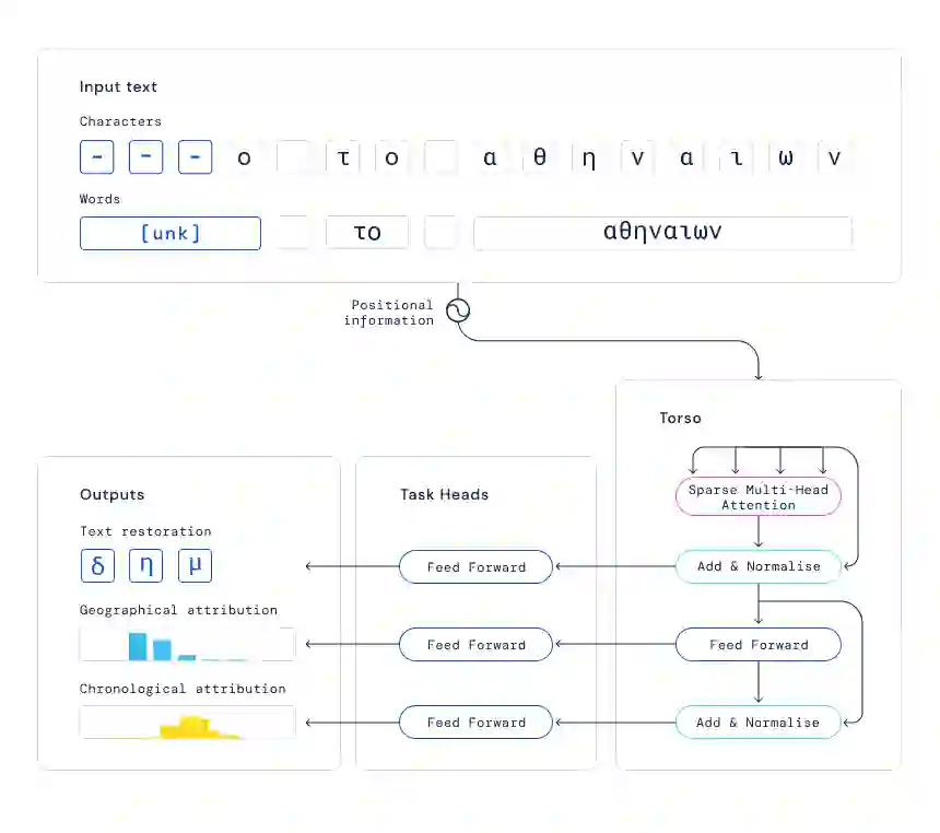 Ithaca 是在最大的希腊铭文数字数据集上训练完成,该数据集由帕卡德人文学院 (PHI)提供,这是一个非营利基金会,成立于 1987 年,该机构旨在为基础研究创建工具人文学。通常来讲,自然语言处理模型使用单词进行训练,它们在句子中出现的顺序以及单词之间的关系可以提供额外的上下文和含义。然而 Ithaca 的铭文损坏严重,丢失了大部分文本块。为了确保模型有效,该研究使用单词和单个字符作为输入。模型核心为稀疏自注意力机制,用来并行计算这两个输入(单词和单个字符)。