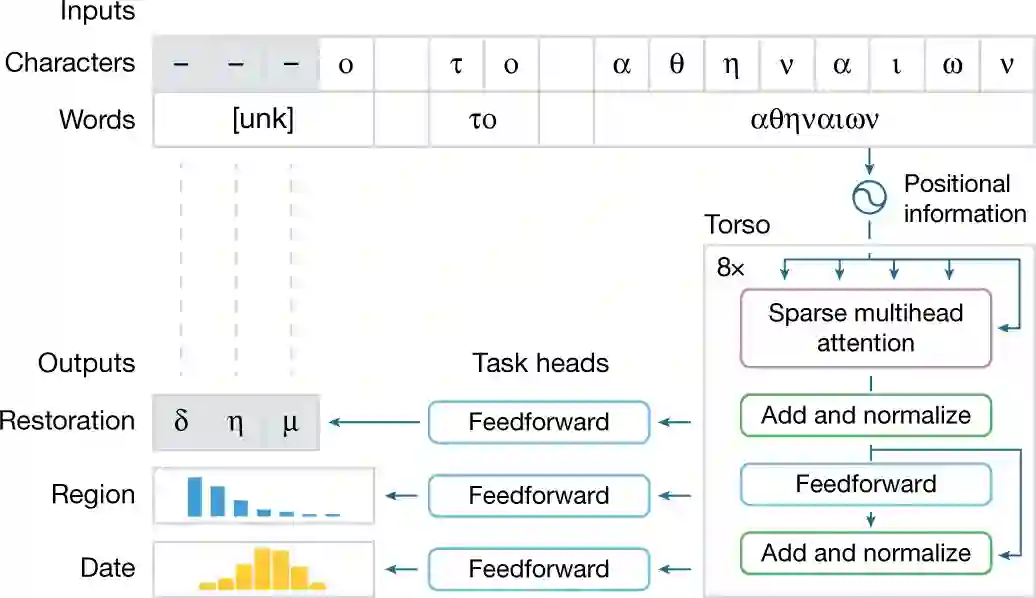 由于部分铭文文字丢失,该研究将字符和单词作为输入,用特殊符号 [unk] 表示损坏、丢失或未知的单词。接下来,为了实现大规模处理,Ithaca 的主干是基于 transformer 的神经网络架构,它使用注意力机制来衡量输入的不同部分(如字符、单词)对模型决策的影响过程。通过将输入字符和单词表示与它们的顺序位置信息连接起来,注意力机制得到输入文本的每个部分的位置。