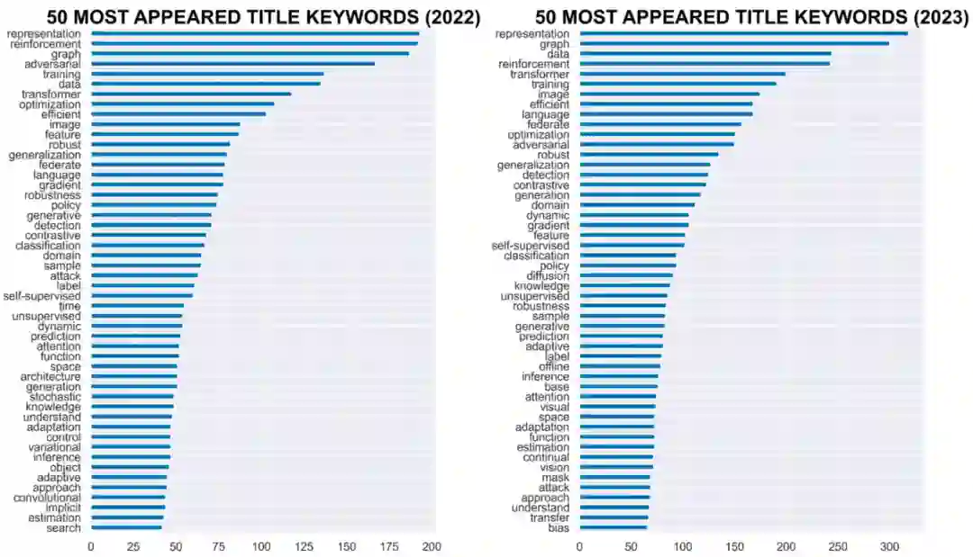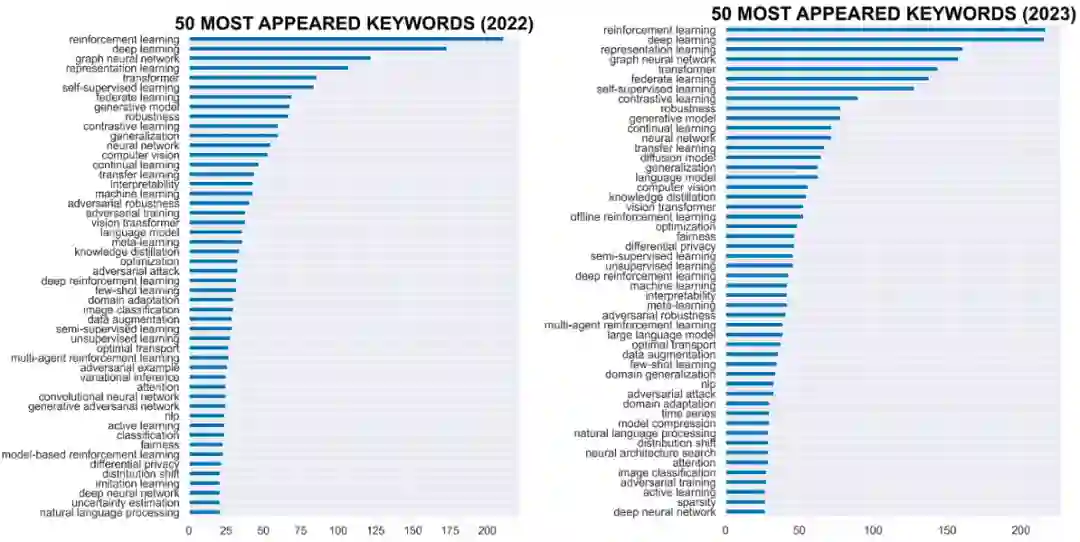 以下条形图列举了提交论文中出现频率排名前 50 的关键词,排名靠前的依旧是强化学习,深度学习,表征学习 以及图神经网络等。两年的投稿趋势变化不大。