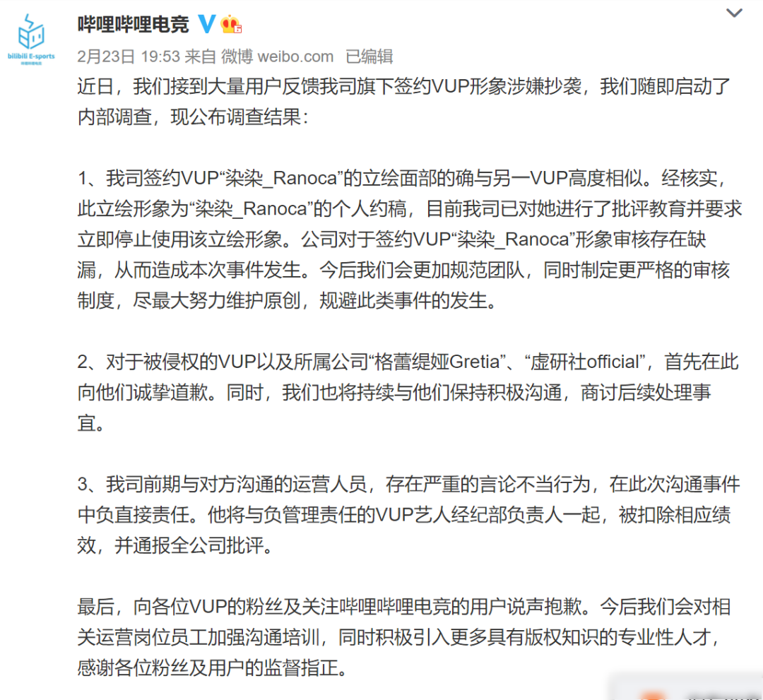 昨日,微博网友@菊菊菊菊菊花猹发文称,朋友设计的VUP形象被哔哩哔哩电竞官方照搬,并在反复交涉无果后,只得到傲慢的答复,此外还将UP主发布的视频删除,最终无奈发博维权。@哔哩哔哩电竞官方微博 之后发文回应,称此立绘形象为 “ 染染_Ranoca ” 的个人约稿,已对她进行了批评教育并要求立即停止使用该立绘形象。与对方沟通的运营人员,存在严重的言论不当行为,将与负管理责任 VUP 艺人经纪部负责人一起,被扣除相应绩效,并通报全公司批评。(3DM)