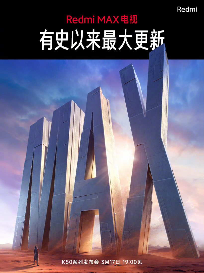 3 月 17 日晚上 7 点 Redmi 将要召开新品发布会,不止是 Redmi K50 系列,今天官方还预热了一款重磅新品 Redmi MAX 超大屏电视。在去年,Redmi 上架了 98 英寸的超大屏电视,售价 19999 元,采用 4K 高分辨率,NTSC 85% 宽广色域、192 分区动态背光。支持 HDR,搭载第九代画质引擎,拥有 20 余项画质调校技术加持,采用 MEMC 运动补偿技术,有效解决高速运动画面在巨幕上观看的拖尾、抖动及重影问题。根据多方消息汇总,这次的 Redmi MAX 的尺寸达到了 100 英寸,售价估计会突破 20000 元。