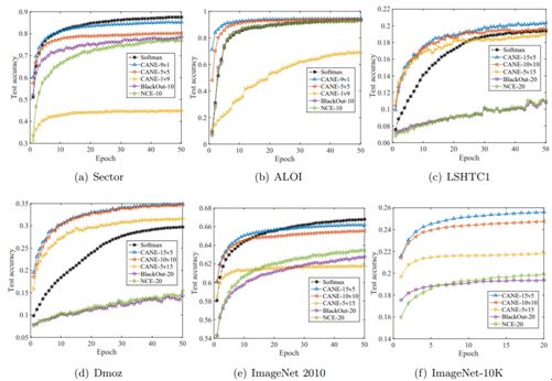 研究者实验了 CANE 方法在有大量类别的多类分类问题和神经语言建模任务中的应用。下图展示了各种方法在不同分类数据集上的测试准确度随 epoch 的变化情况。可以看到,有更大候选项集的 CANE 在准确度方面基本优于其它方法,有时甚至能超过 softmax 方法。而且 CANE 方法的收敛速度明显胜过噪音对比估计(NCE)和 Blackout。