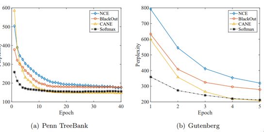 下图则给出了神经语言建模实验的结果。可以看到,CANE 方法的收敛速度比 NCE 和 Blackout 更快,同时还达到了与 softmax 方法同等的困惑度。