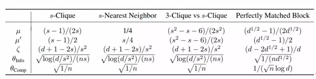 这两个结构量的一大突出性质是它们仅依赖于被测试的组合结构的拓扑性质。它们能帮助研究者理解组合推理问题的结构性质决定其计算复杂度的方式。研究表明,如果 µ 远小于 µ',则信息论下界和计算有效的下界之间会存在明显差距。下面给出了 4 个案例的具体最优比率;可以看到,这些案例都存在统计与计算的权衡。