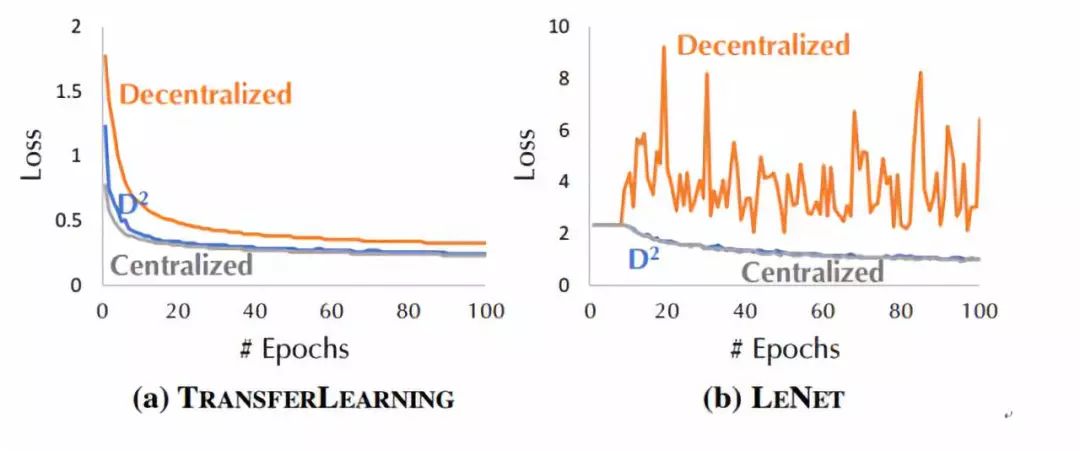 可以看到,D-PSGD 算法的收敛速度比中心化方法慢,而 D2 也比 D-PSGD 快很多,并且损失非常接近中心化算法。