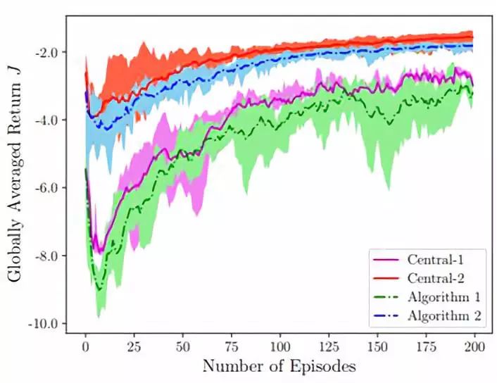 研究者使用线性和非线性函数近似执行了大量模拟实验,对所提出的算法进行了验证。下图给出了当使用神经网络进行函数近似时,在协同导航任务上的全局平均奖励。其中 Central-1 和 Central-2 分别是算法 1 和算法 2 对应的中心化方法。