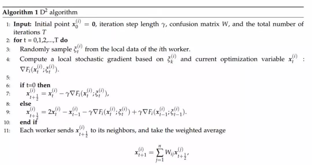D2 基于标准的 D-PSGD 算法,但添加了一个降低方差的组件。在这种 D2 算法中,每个工作器都会存储上一轮迭代的随机梯度和局部模型,并将它们与当前的随机梯度和局部模型线性地结合到一起。这能将收敛速度改善,其中 ζ2 是不同工作器上的数据差异,σ2 是每个工作器内的数据方差,n 是工作器的数量,T 是迭代次数。