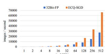 在使用 512 个 GPU 进行训练时,ECQ-SGD 相对于普通 SGD 实现了 143.5% 的加速(每秒各 66.42k 与 27.28k 张图像)。如果节点之间的带宽更小,这样的优势还会更加显著。