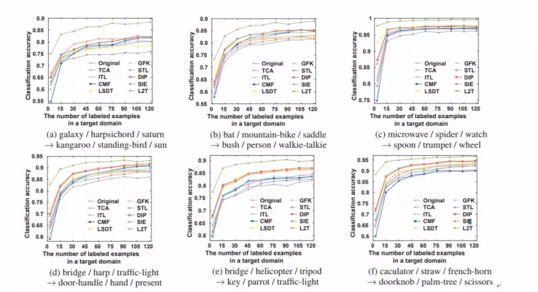 可以看到,不管源域与目标域有较紧密的联系(比如 (a) 中的“galaxy”、“saturn”和“sun”)还是没有显著关联(比如 (c) 和 (f)),L2T 方法的表现都明显优于其它所有基准方法。