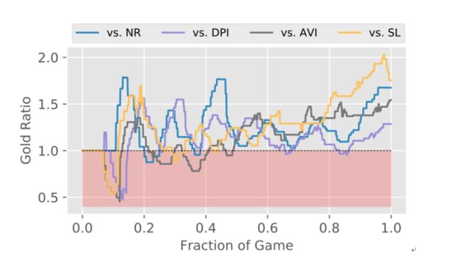研究者还使用深度神经网络实现了这种基于反馈的树搜索算法并在《王者荣耀》1v1 模式上进行了测试。为了进行对比,研究者训练了 5 个操控英雄狄仁杰的智能体,结果他们提出的新方法显著优于其它方法,下图给出了他们的方法训练的智能体相对于其它智能体随时间的金币比值变化。