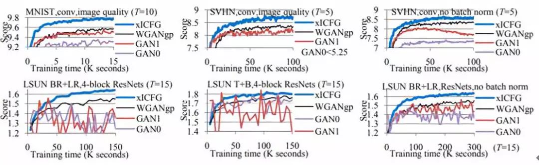 研究者进行了图像生成的实验,结果表明他们提出的新方法是有效的。下图给出了各种方法生成的图像的质量(inception 分数)随训练时间的变化情况。