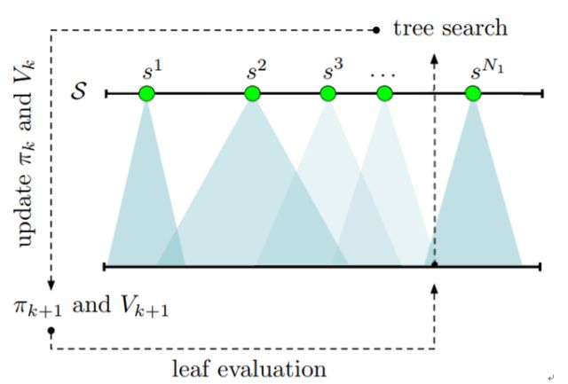 研究者将这一思想融合到了一个基于反馈的框架中,其中 MCTS 会使用其根节点处生成的观察结果来更新自己的叶节点评估器。其反馈过程如下图所示:(1)从一批采样的状态(三角形)开始运行一组树搜索,(2)使用第 k 次迭代时的策略函数近似(PFA)πk 和价值函数近似(VFA)Vk 的叶估计被用于树搜索过程,(3)使用树搜索结果更新 πk+1 和 Vk+1。