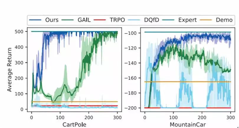 研究者在一系列常见的基准稀疏奖励任务上进行了实验。结果发现,他们提出的方法的表现甚至可媲美用在理想密集奖励环境中的策略梯度方法;而且即使演示很少且不完美,这种新方法依然表现优异。下面两张图给出了新提出的 POfD 方法与几种强基准方法分别在具有离散动作空间和连续工作空间的稀疏环境中的学习曲线。