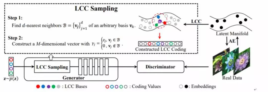 上图展示了该论文提出的 LCC-GAN 方案。研究者首先使用了一个自动编码器(AE)在隐含流形上学习了嵌入来获取数据中的含义信息。然后,他们又使用 LCC 学习一组基数来在该隐含流形上构建局部坐标系统。之后,他们再通过使用一个与一组编码相关的线性函数来近似生成器而将 LCC 引入了 GAN。基于这种近似,他们再通过利用在隐含流形上的局部信息而提出了一种基于 LCC 的采样方法。LCC-GAN 的具体训练过程如下: